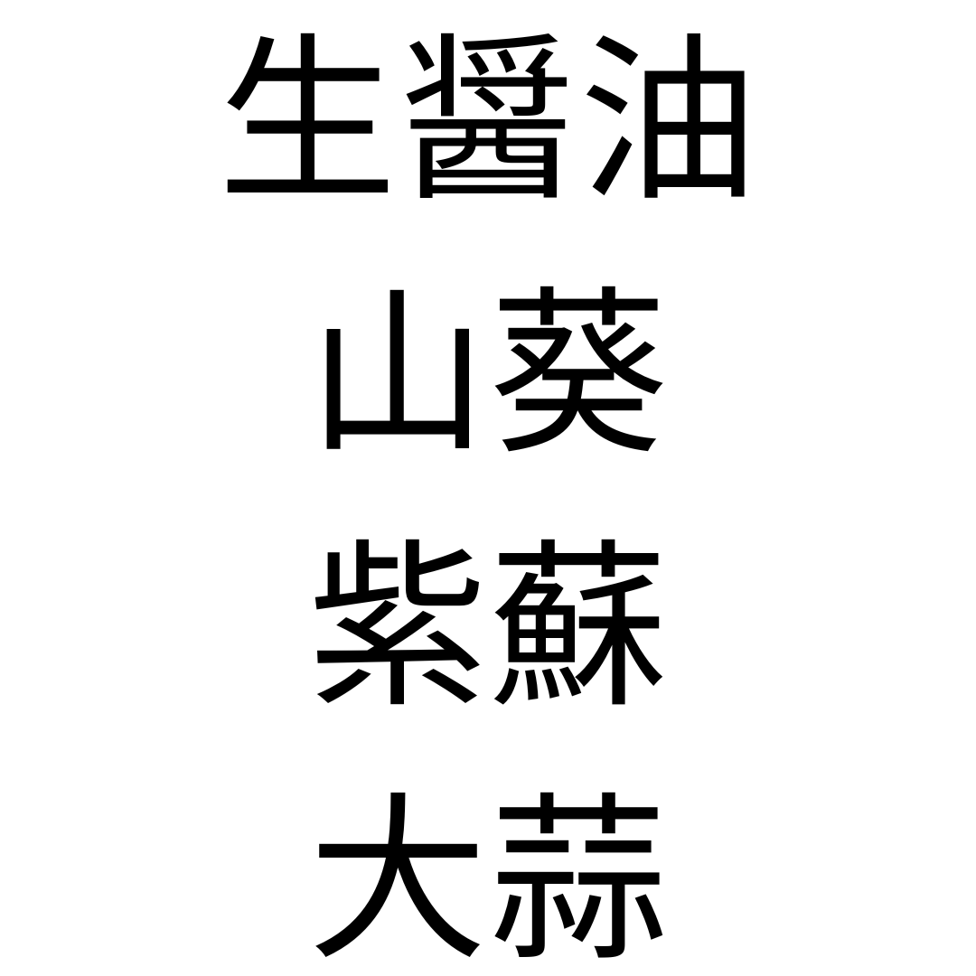 *読み方:山葵 (わさび)紫蘇(しそ)大蒜(にんにく)